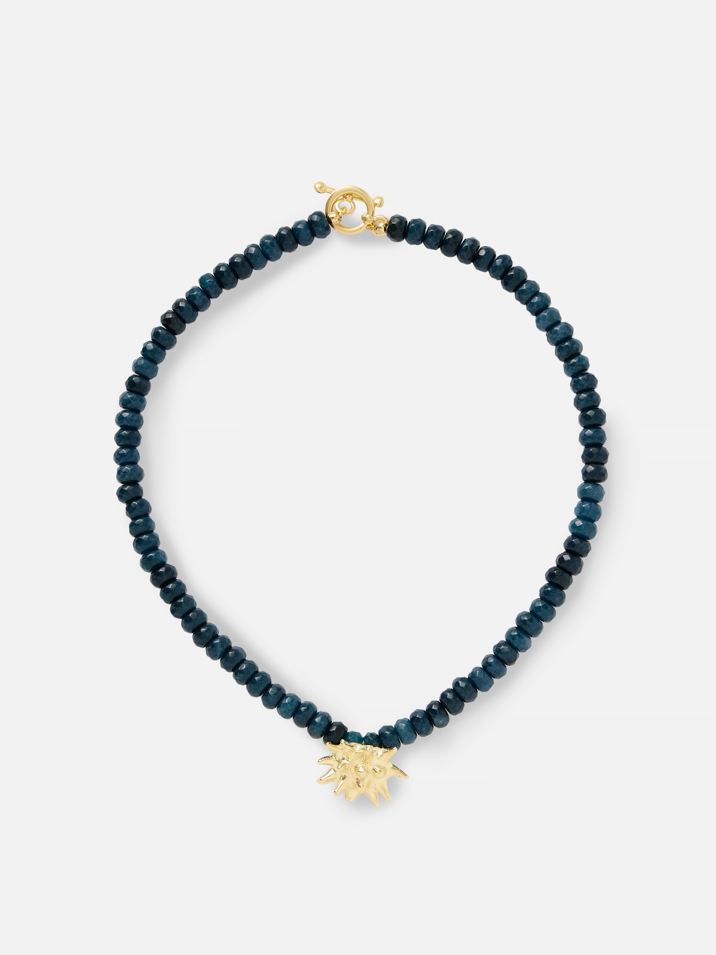 The Sea Urchin Necklace features a strand of natural deep blue jade beads, chosen for their rich tone and natural variation. At its centre sits YSSO's sculptural golden sea urchin.